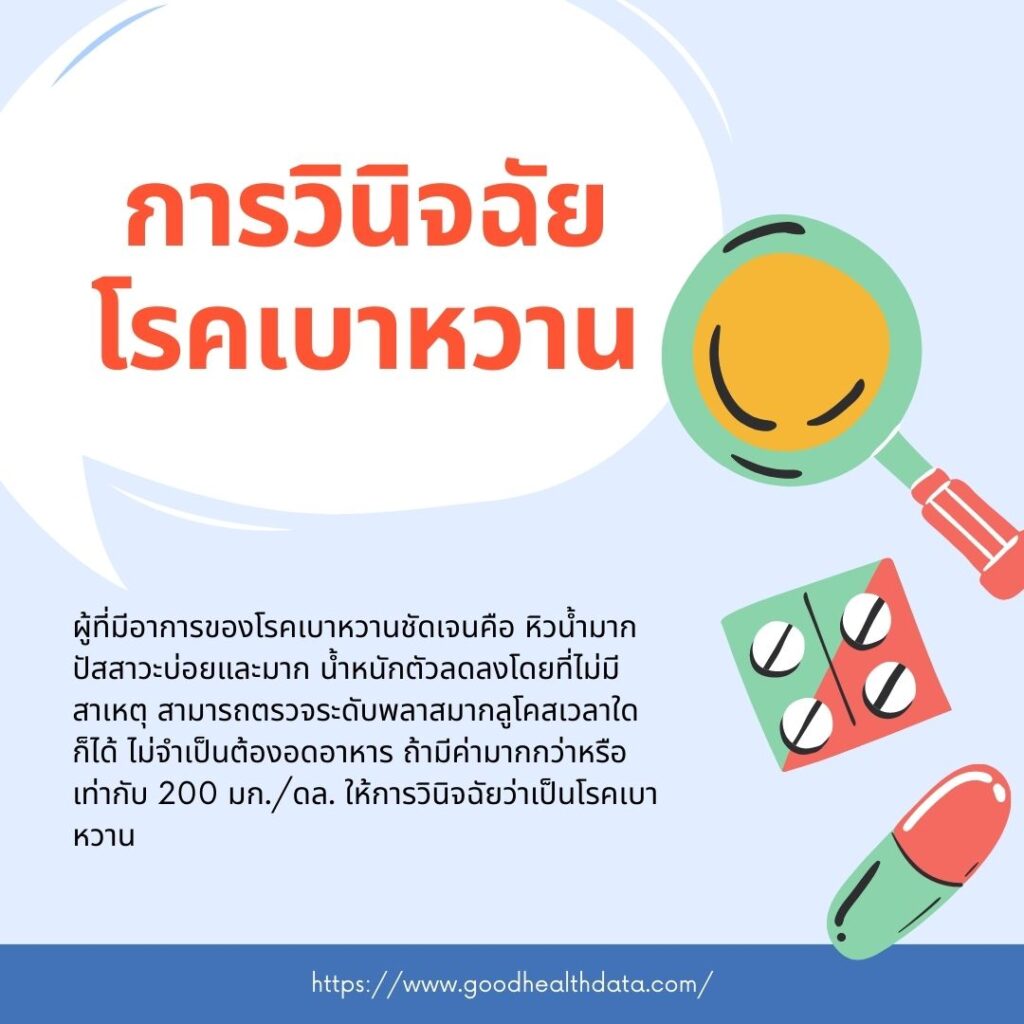 - การตรวจระดับพลาสมากลูโคสตอนเช้าหลังอดอาหารข้ามคืนมากกว่า8ชั่วโมง(FPG)พบค่า≥126มก./ดล. ให้ตรวจยืนยันอีกครั้งหนึ่งต่างวันกัน